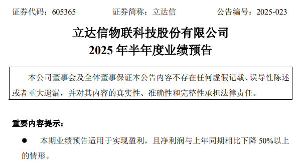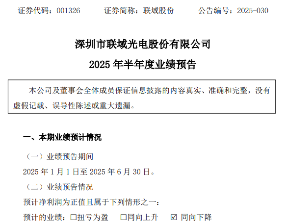 联域股份:2025年上半年净利同比预降77.57%-82.39%