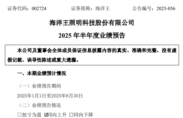 海洋王:预计2025年上半年归母净利同比增长87.64%—129.34%