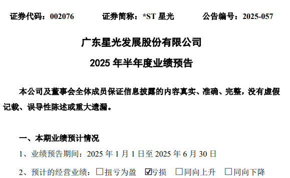 *ST星光:预计2025年上半年亏损240万元-350万元