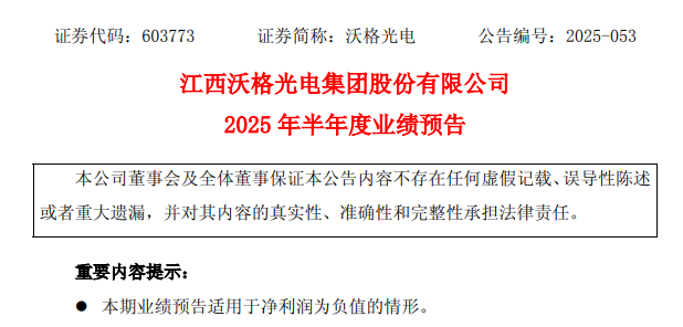沃格光电:预计2025年上半年亏损4500万元-6500万元