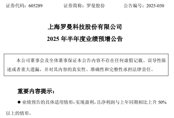 罗曼股份:预计2025年上半年净利润为1200万元~1800万元,同比增长134.07%~251.1%