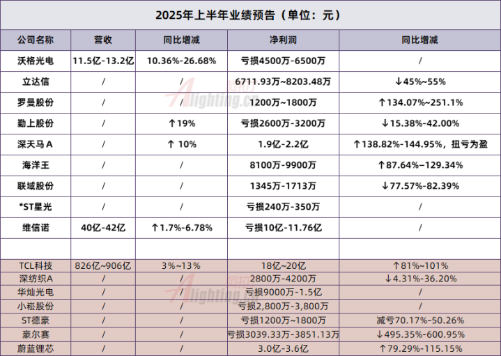 2025年7月16日,阿拉丁照明网查询相关企业公告,汇总以下部分LED照明产业链相关企业的2025上半年业绩预告,如下图所示,16家企业中有8家归母净利润亏损,其中罗曼股份、深天马A、海洋王、TCL科技、蔚蓝锂芯预计实现业绩同向上升。更多详情解读如下: